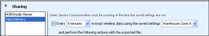 確保您希望在數據文件中共享的所有傳感器都顯示在要繪制/導出的傳感器列表中。 選擇預設并選擇預設的時間范圍,以確定每次數據傳送運行時將導出多少數據。 在此示例中,我們選擇了“過去12小時”,這意味著只有過去12小時的數據將通過數據傳送導出。 顯示最近12小時的數據供參考。 單擊保存設置按鈕,然后鍵入一個名稱,該名稱也將用于數據傳遞文件名,并按Enter鍵。 您的配置設置將被保存。 1.打開HOBOnode管理器。 2.單擊操作按鈕,然后選擇編輯HOBO數據節點首選項。 3.選擇共享,然后選擇數據傳送。 4.選擇要從網絡中保存數據的頻率(從1分鐘到7天)。這將確定您用來共享數據的日程表。 5.選擇在繪圖/導出無線數據中創建的保存設置的名稱,例如上述示例中的“倉庫區A”。 6.選擇您要共享文件的方式:通過電子郵件,FTP或保存到計算機或網絡位置。您可以選擇多種共享文件的方法。 電子郵件: 鍵入要發送文件的電子郵件地址,如果要在通過電子郵件發送之前壓縮文件,請選中該復選框。注意:數據傳輸使用為警報電子郵件通知配置的相同電子郵件設置。如果您從未配置過警報電子郵件,則必須先執行此操作,即使您不打算設置任何警報。 輸入要放置文件的FTP位置的FTP服務器名稱,目錄名稱(遠程文件夾),用戶名和密碼。 測試FTP連接以確保其成功將文件傳送到指定位置。 如果要在通過FTP傳送文件之前壓縮文件,請選中該復選框。 選擇是否要在每次傳輸新文件時在該FTP位置覆蓋現有文件,或者每次要創建新的帶時間戳的文件。 將其保存到硬盤驅動器或網絡: 選擇要保存文件的目錄。 選擇是否要在每次保存文件時覆蓋文件,或者每次要創建新文件。 完成配置數據傳遞設置后,在首選項窗口中單擊“確定”。 然后,將根據您選擇的計劃保存和共享來自數據網絡的傳感器數據。數據將保存為.txt,.csv或.xls文件,您可以導入到HOBOware,Microsoft Excel和其他程序進行分析。文件類型由“首選項”中的導出設置確定。 筆記: 除非設備通信也在運行,否則數據傳送將不會運行。這意味著如果您選擇在關閉HOBOnode Manager時停止設備通信,則數據傳輸也將停止。重新啟動設備通信后,將按照先前配置的計劃重新開始數據傳輸。 或這個: 更多HOBO記錄儀信息,請訪問HOBO中國官網:http://www.rq1muh.cn/