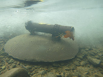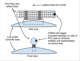 作為其“監(jiān)測天然氣發(fā)展”計劃的一部分,在特拉華州和Lackawaxen河流和在賓夕法尼亞州兩個小溪哪里鉆很可能發(fā)生的DRBC的監(jiān)控,建模與評估處已經(jīng)部署HOBO®U24電導率和溫度記錄儀第一。低調(diào)的混凝土基地,構(gòu)建由混凝土澆筑成一個飛碟雪橇記錄儀的安裝。兩個短鋁管從混凝土基座突出部分,和具有孔的橫PVC管位于固定到基座容納傳感器,它被固定用拉鏈的關(guān)系。在PVC管內(nèi)的傳感器的位置最小化氣泡以及沉積物可能在傳感器否則積聚。
