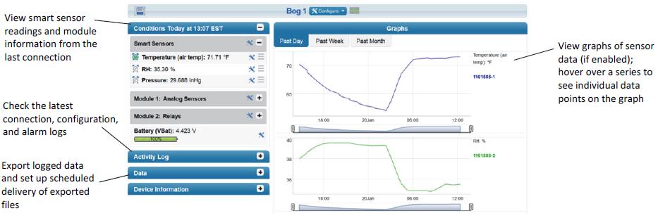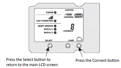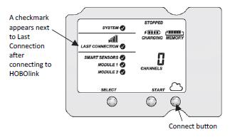 使用“選擇”按鈕返回到顯示所有傳感器和模塊的主LCD屏幕,然后按“連接”按鈕(云示例應如圖所示可見)。這是HOBOlink識別新添加的傳感器所必需的。