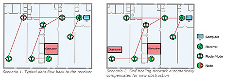 這些無線數據記錄節點是電池供電的裝置,將記錄的數據傳輸回用戶指定的時間間隔的中央接收器。他們克服了傳統的無線日志記錄系統的一個主要問題,在每個節點不必在直接與接收器的通信。每個節點可以設置在雙目的模式下,通過連接到交流電源,作為一個數據記錄節點,以及作為一個路由器從其他節點上傳遞的數據。通過路由器和數據日志節點的組合,系統形成一個自愈網絡,以確保數據到達接收器,通過一個備用路徑,應現有的路徑失敗或被阻礙。