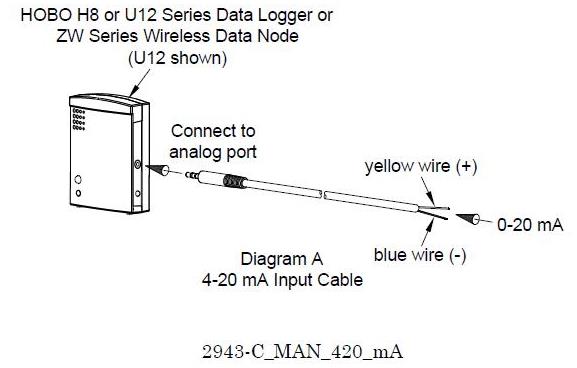 4-20mA輸入電纜,可用于HOBO H8 和 U12 系列數(shù)據(jù)記錄儀和ZW系列數(shù)據(jù)節(jié)點(diǎn)。 4-20輸入電纜 - 該電纜(部件號CABLE-4-20mA)測量電流從0到20.1 mA。必須連接4-20mA電纜,使電流流過,并具有正確的極性,如圖A所示。(不要暴露于20mA以上的電流或負(fù)電流)不要切斷灰色電纜的末端